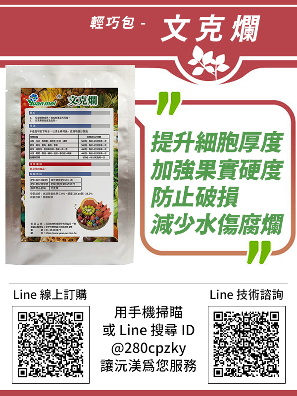 - 提高果實品質,增加色澤及光亮度、甜度、果實結實,避免儲運傷害。